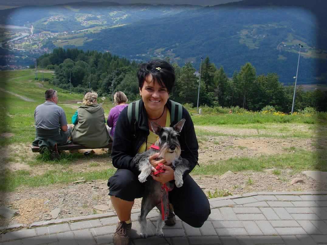 No i jest: Shanti i ja:)) . Rok 2009. Zdobyłyśmy właśnie górę Żar. Spędzaliśmy wakacje w Żywcu, nad jeziorem Żywieckim. Równie cudownie i pięknie jak w Lubawce. Kocham góry i chyba powinnam być żoną jakiegoś górala:)))) na szczęście mój K. jest kochany i zabiera mnie na wczasy w góry, bo polskie morze mnie nie bawi.